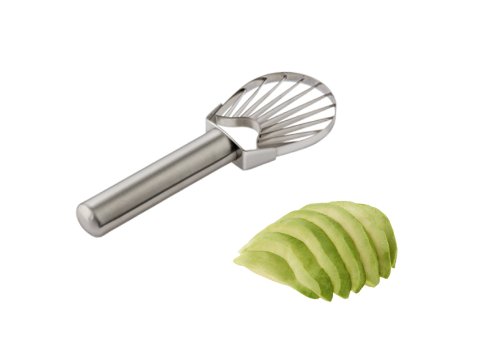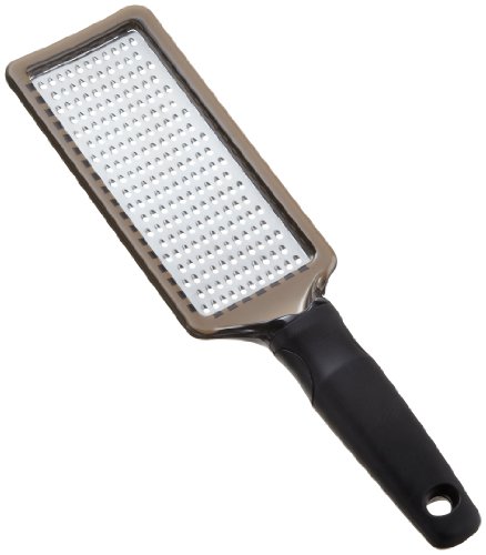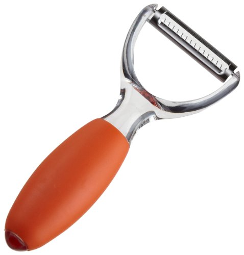 An inexpensive alternative to a professional stainless-steel mandoline, this device makes it possible to quickly, uniformly, and safely slice and julienne vegetables and fruits. It also shreds cabbage and neatly dices potatoes, tomatoes, and onions. For safety, a holder firmly grips food with stainless-steel prongs so fingers are protected from the German surgical-steel blades, and the three inserts accompanying the device lock in position. The inserts act as a guide for slicing against the V-frame's knife that reverses to create slices either 1/4-inch or 1/16-inch thick and two julienne inserts for creating 1/8-inch or 3/8-inch strips. For storage, the V-frame, all three inserts, and the safety holder fit into a caddy that can stand upright on the counter, lie flat in a drawer, or hang on the wall. Made of rugged plastic, the device measures 15 inches long and 6 inches wide when assembled for storage.
